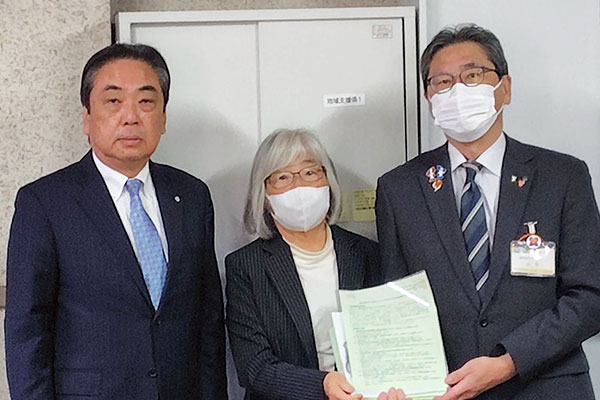 | 山田局長に陳情書を渡す鈴木会長と加藤一登名古屋市会議員 |